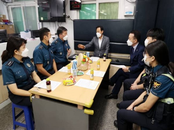 이어 수원역 앞 매산지구대로 자리를 옮긴 장현국 의장은 현장에서 합류한 정승현 운영위원장(더민주, 안산4)와 함께 소속 경찰들과 연휴 기간 중 근무계획에 대해 이야기를 나눴다.