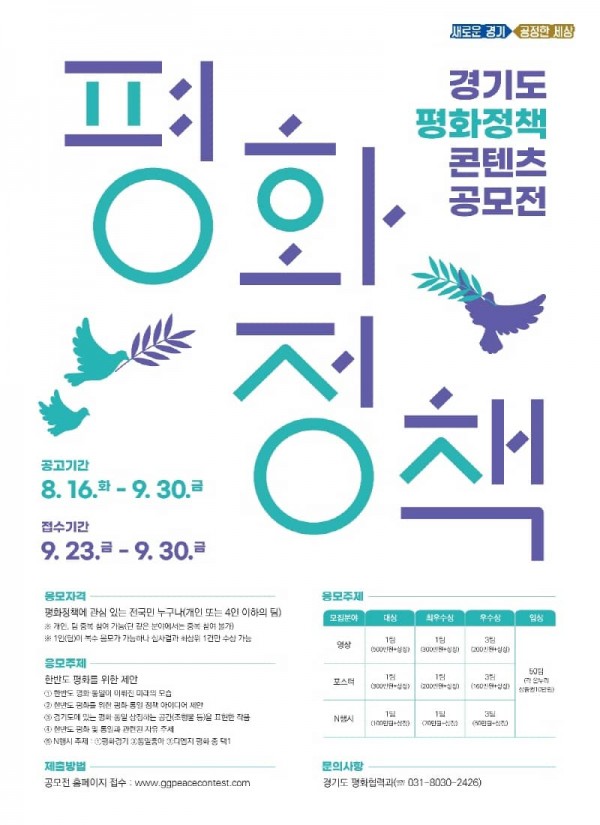 참여 희망자는 오는 9월 23일부터 9월 30일까지 경기도 평화정책 콘텐츠 공모전 홈페이지를 통해 접수하면 된다.