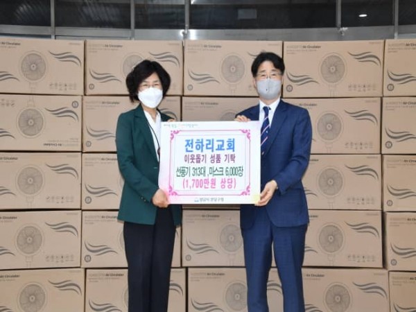 성남시 분당구 이매동 소재 전하리교회(담임목사 임흥옥)는 코로나19 확산 장기화로 경제적 어려움을 겪고 있는 저소득층에게 전달해달라며 5월 26일 분당구에 1700만원 상당의 서큘레이터와 마스크를 기탁했다.